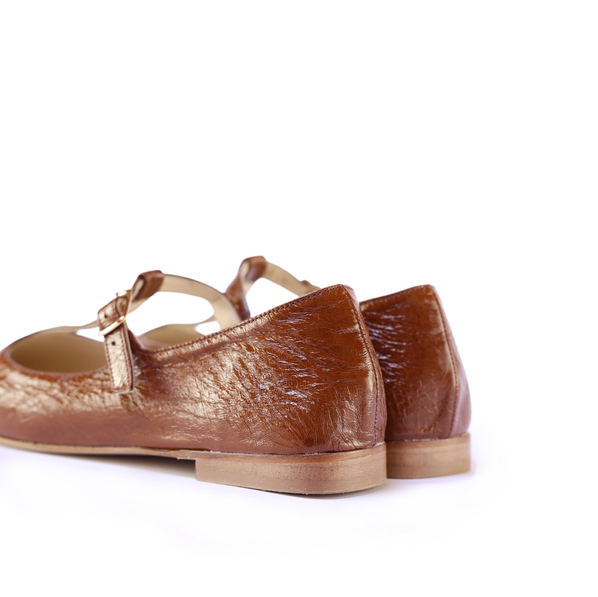 Ballerina in pelle latex 100% Made in Italy con cinturino sul collo del piede con tacco di 1cm. Lavorazione a sacchetto che dona alla calzata morbidezza e comfort assoluto. Punta quadrata.