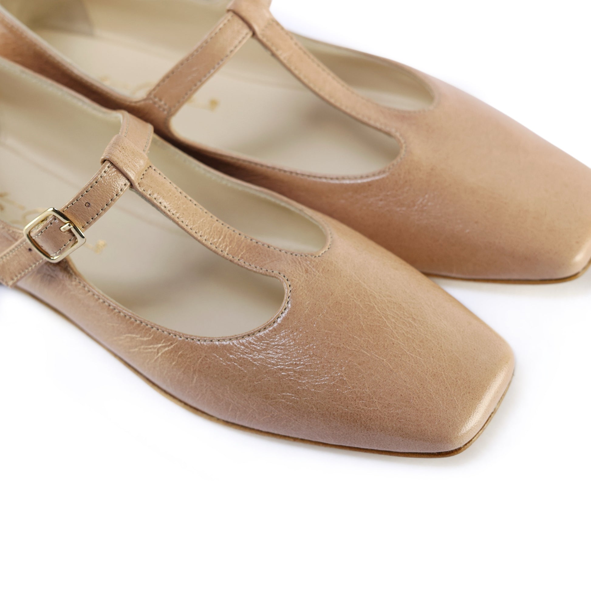 Ballerina in pelle latex 100% Made in Italy con cinturino sul collo del piede con tacco di 1cm. Lavorazione a sacchetto che dona alla calzata morbidezza e comfort assoluto. Punta quadrata.
