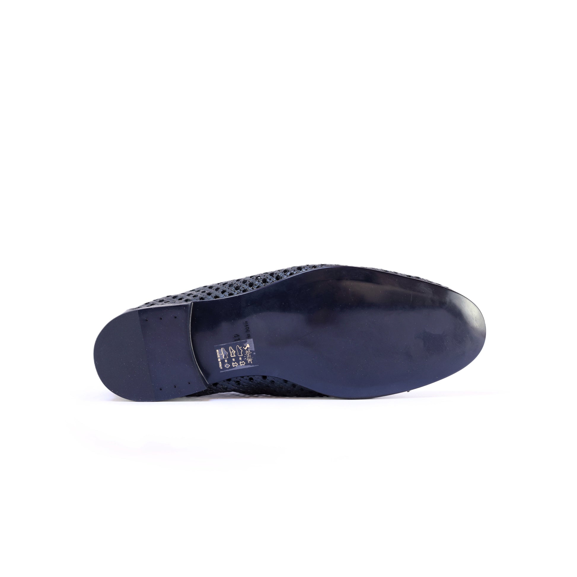 Mocassino in pelle forata lavorata artigianalmente e scelta 100% Made in Italy. Nappine arricchiscono il modello. Tacco Basso. Lavorazione incollata.